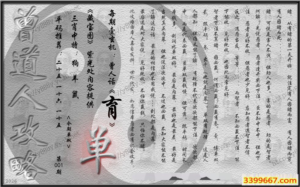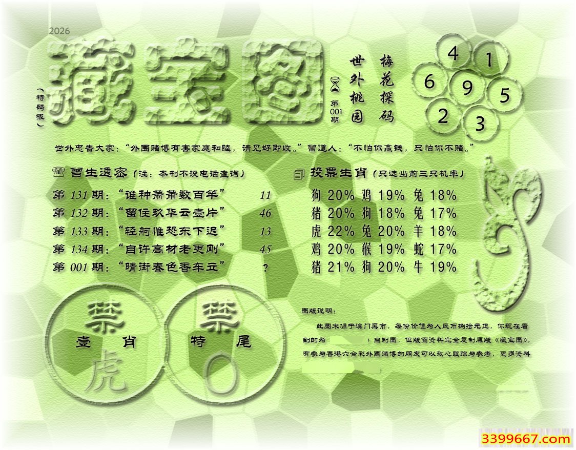 001期藏寶圖 新:郊外黄垓端可厌 老:晴街春色香车立 禁:虎 禁:0尾 玄機字:《育》
