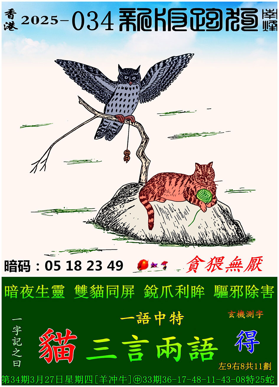 034期:新版跑狗一字記之曰【貓】 玄機測字:【得】