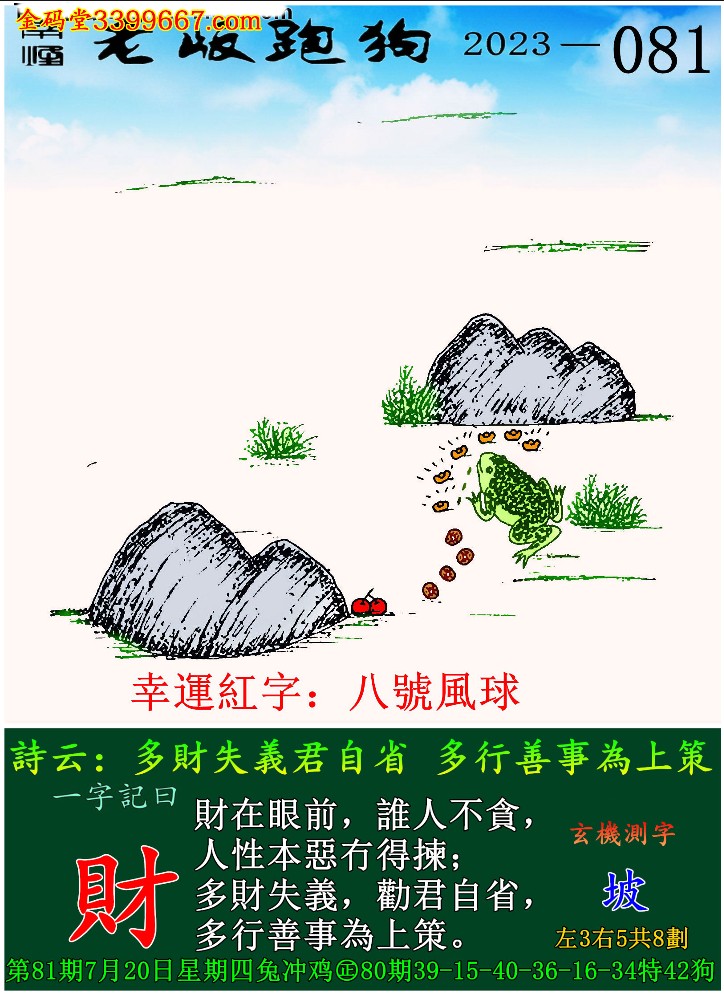 081期老版跑狗一字記之曰:【財】 玄機測字:《坡》