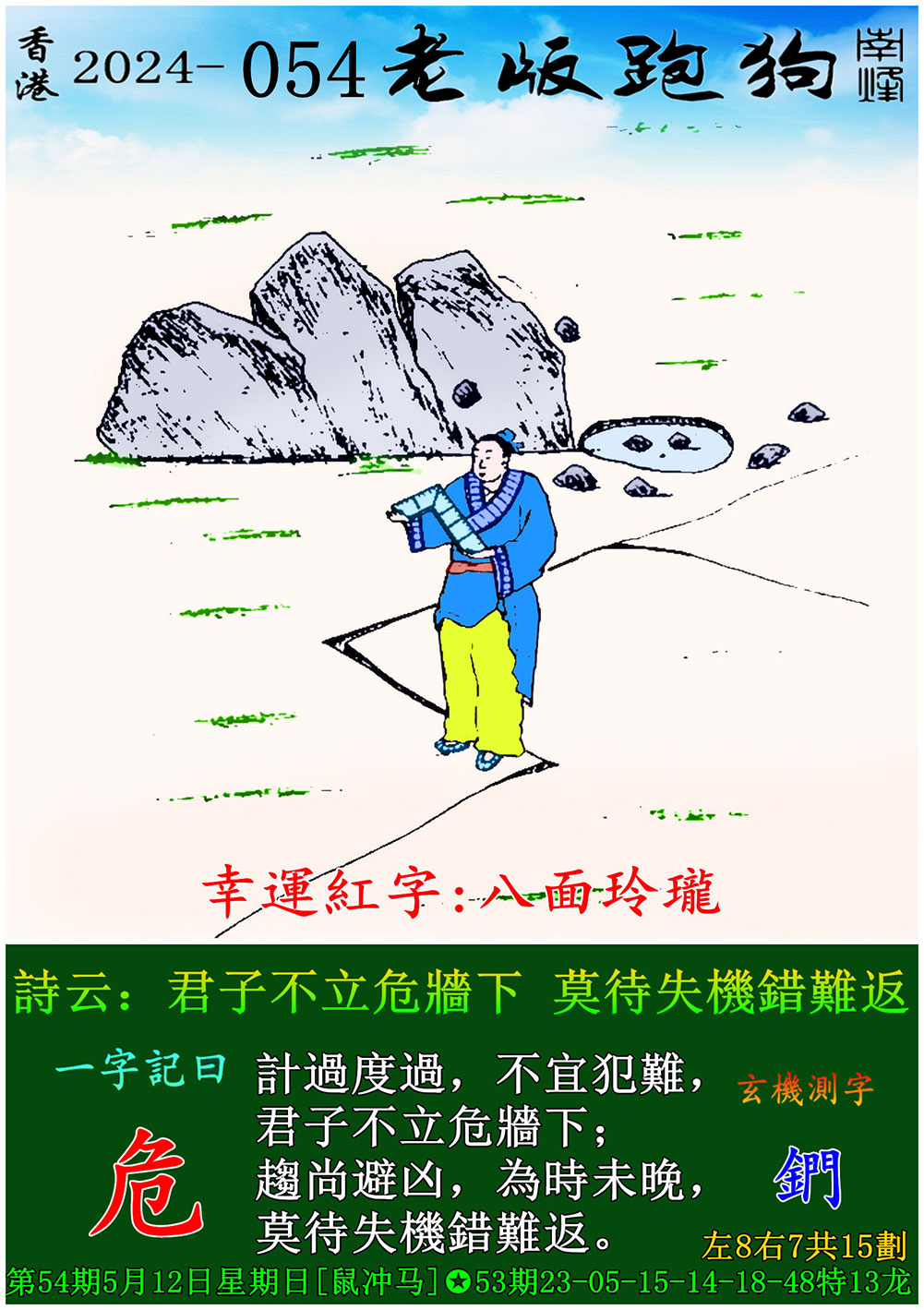 054期老版跑狗一字記之曰:【危】 玄機測字:《鍆》