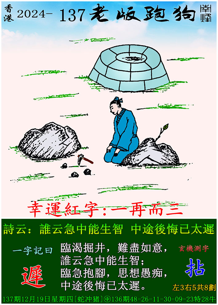 137期老版跑狗一字記之曰:【遲】 玄機測字:《拈》