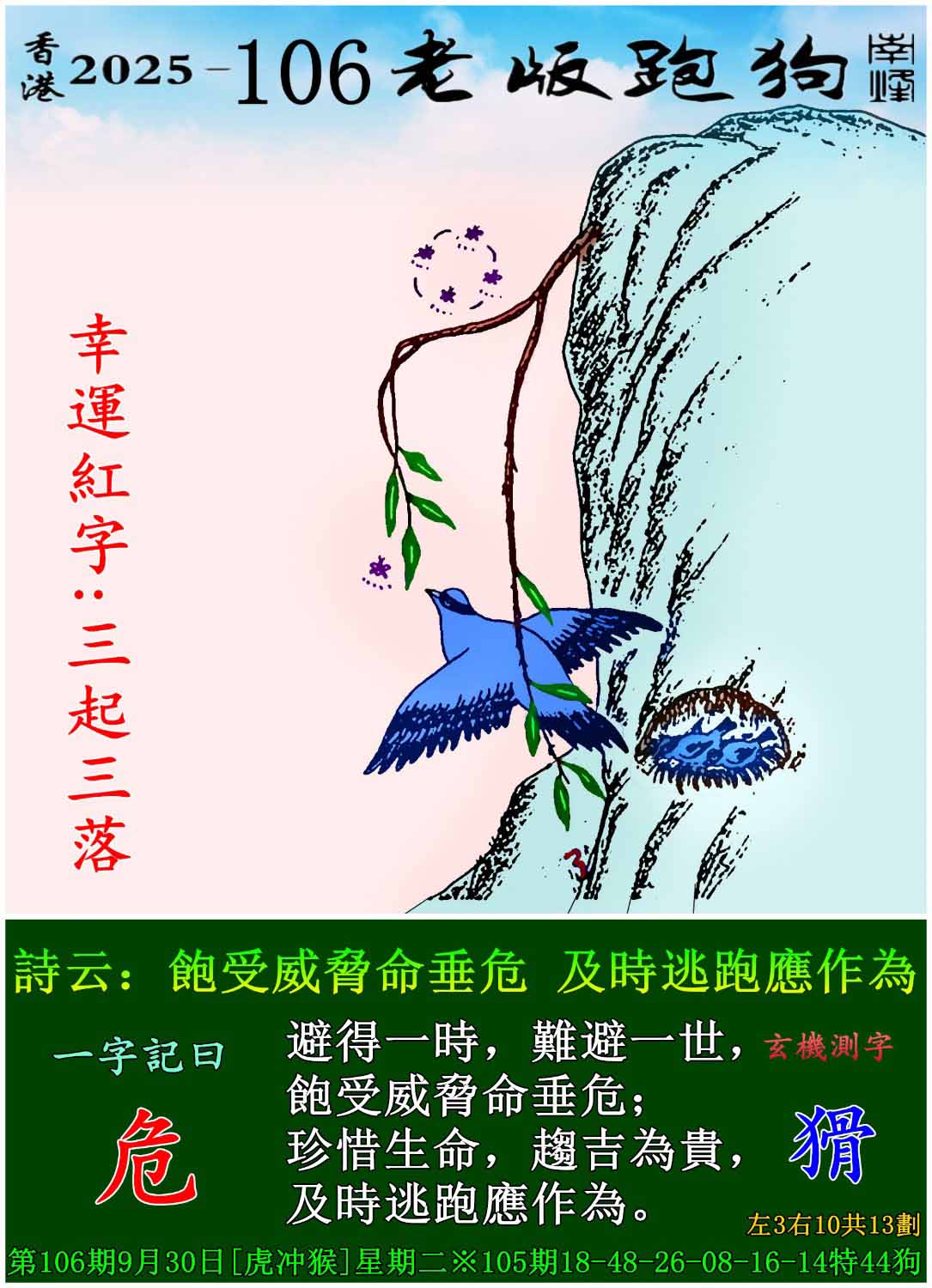 主题 : 106期老版跑狗一字記之曰:【危】 玄機測字:《猾》
