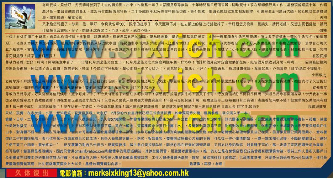 【6】尊敬的品總您好:好久沒有寫信問候您 !近來可好?中了 !今天有空看了六信紅字毛如雨下 !就想到了成語多如牛毛!就買了牛肖!今次寫信給你不問肖不問碼 !知道呂總您喜歡聊家常 !今天我有一事想呂總給點意見!我做農資的!現在生意正是風生水起之時!我老表又要我入股開個大的農資超市!年底有分紅保底十萬!在農資超市上班每個月有工資领!表面看起來很不错!但實際情況做起來有點難!萬一做不成功,那我就破產了!現在站在十字路口,不知道怎麼選擇!請呂總給點建議參考!是你該怎麼還擇呢?祝呂總龍馬精神 日進斗金 紅字 毛如雨下 ---現實與夢境