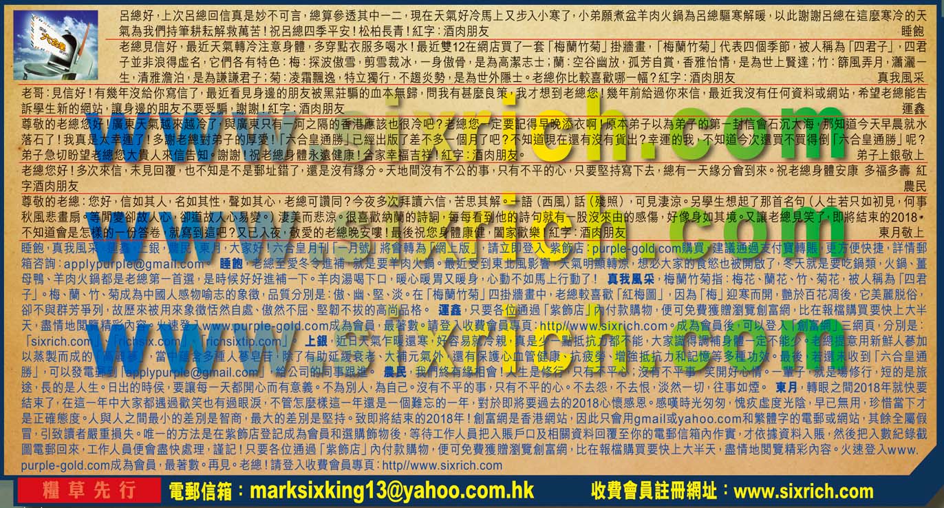 【4】尊敬的老總您好!廣東天氣越來越冷了,與廣東只有一河之隔的香港應該也很冷吧?老總您一定要記得早晚添衣啊!原本弟子以為弟子的第一封信會石沉大海,那知道今天早晨就水落石了!我真是太幸運了!多謝老總對弟子的厚愛!「六合皇通勝」已經出版了差不多一個月了吧?不知道現在還有沒有貨出?幸運的我,不知道今次還買不買得倒「六合皇通勝」呢?弟子急切盼望老總您大贵人来信告知。谢謝!祝老德身體永遠健康!合家幸福吉祥!紅字:酒肉朋友 ---弟子上銀敬上