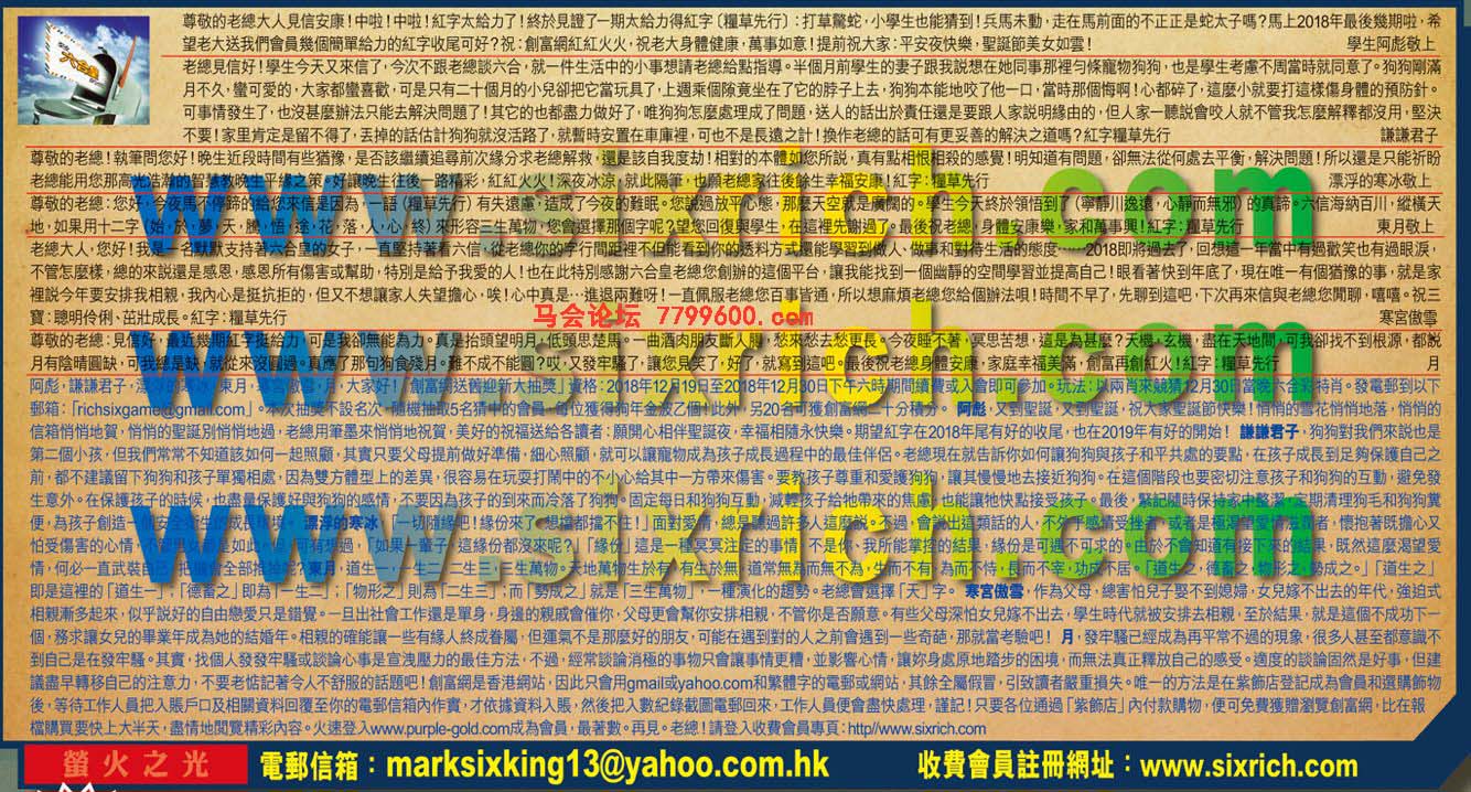 【1】尊敬的老總大人見信安康!中啦!中啦!紅字太给力了!終於見證了一期太给力得紅字(糧草先行) :打草驁蛇,小學生也能猜到!兵馬未動,走在馬前面的不正正是蛇大子嗎?馬上2018年最後幾期啦,希望老大送我們會員幾固簡單給力的紅字收尾可好?祝:創富網紅紅火火,祝老大身體健康.萬事如意!提前祝大家:平安夜快樂,聖誕節美女如雲! ---學生阿彪敬上