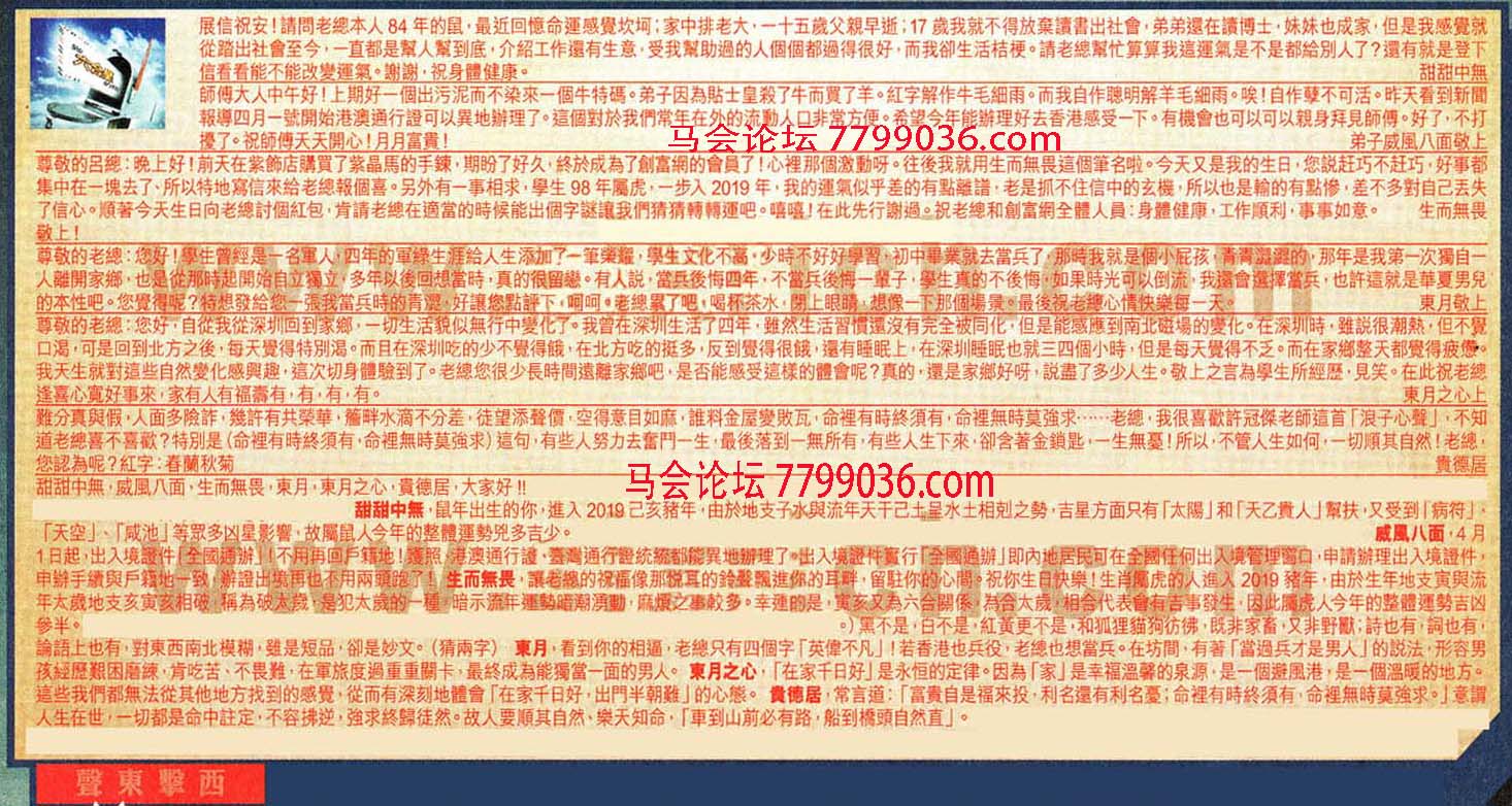 【2】師傅大人中午好!上期好一個出污泥而不染來一個牛特碼。弟子因為貼士皇殺了牛而買了羊。紅字解作牛毛細雨。而我自作聰明解羊毛細雨。唉!自作孽不可活。昨天看到新聞報導四月一號開始港澳通行證可以異地辦理了。這個對於我們常年在外的流動人口非常方便。希望今年能辦理好去香港感受一下。有機會也可以可以親身拜見師傅。好了,不打擾了。祝師傅天天開心!月月富贵! ---弟子威風八面敬上