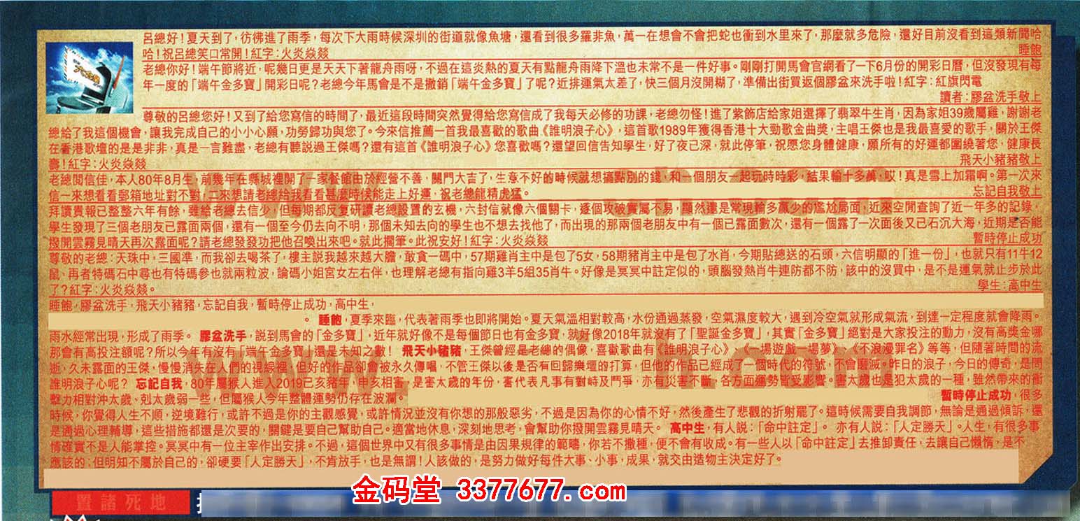 【5】拜讀貴報已整六年有除,雖給老總去信少,但每期都反復研讀老總設置的玄楼,六封信就像六個關卡,逐個攻破實属不易,雖然還是常现輪多赢少的尷尬局面,近来空閒查询了近一年多的記錄,學生發現了三個老朋友已露面兩個,還有一個至今仍去向不明,那個未知去向的學生也不想去找他了,而出現的那兩個老朋友中有個已露面數次 ,還有一個露了一次面後又已石沉大海,近期是否能撥開雲霧見晴天再次露面呢?請老總發發功把他召唤出來吧。就此搁筆。此祝安好!紅字:火炎焱燚 ---暂時停止成功