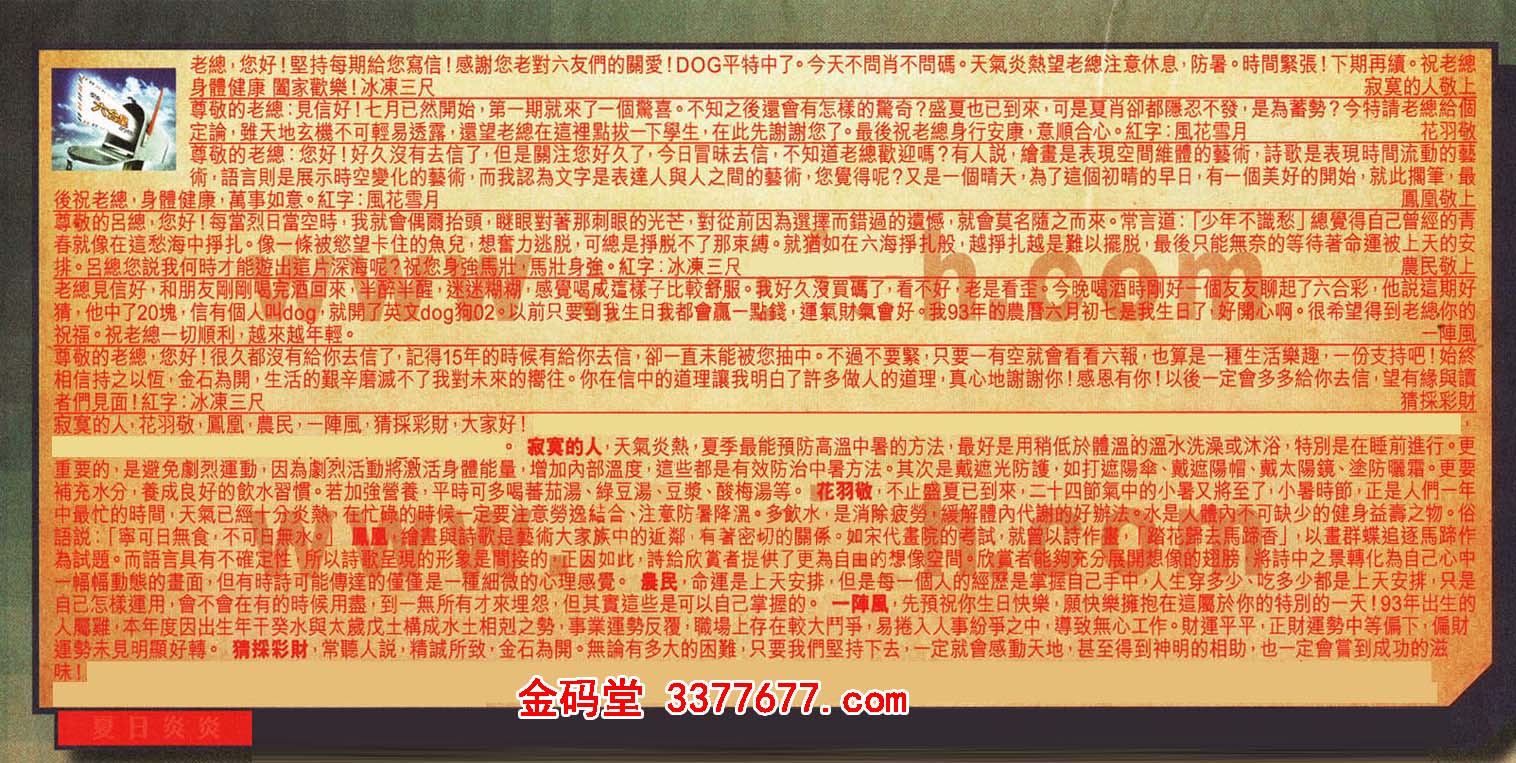 【1】老總,您好!堅持每期給您寫信!感謝您老對六友們的關愛!DOG平特中了。今天不問肖不問碼。天氣炎熱望老總注意休息,防暑。時間緊張!下期再續。祝老總身體健康闔家歡樂!冰東三尺 ---寂寞的人敬上