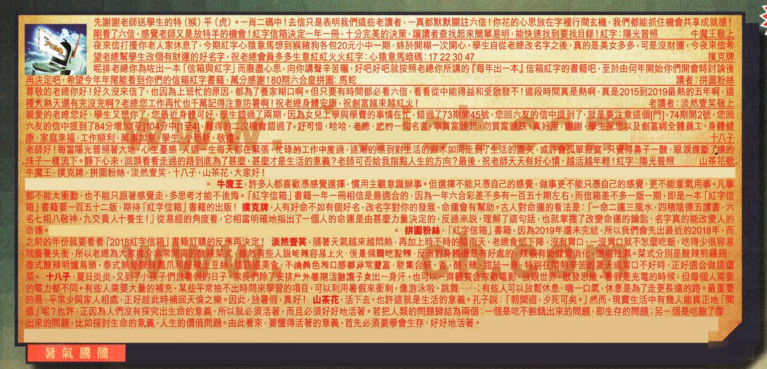 【3】呢排老總你為吐出一本「信箱與紅字」而廢盡心思,向你講聲辛苦曬,好吧好吧就按照老總你所講的『每年出一本』信箱紅字的書籍吧,至於由何年開始你們開會時討論後再決定吧,希望今年年尾能看到你們的信箱紅字書籍;萬分感謝! 80期六合皇拼圖:馬蛇 ---讀者:拼圖粉絲