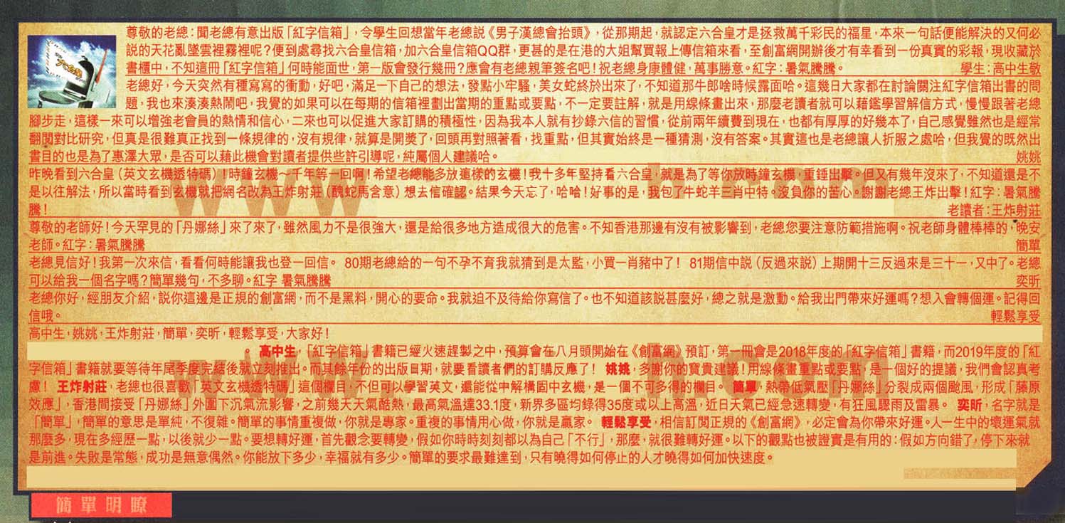 【1】尊敬的老總:聞老總有意出版「紅字信箱」,令學生回想當年老總說《男子漢總會抬頭》, 從那期起,就認定六合皇才是拯救萬千彩民的福星,本來一句話便能解決的又何必說的天花亂墜雲裡霧裡呢?便到處尋找六合皇信箱,加六合皇信箱QQ群,更甚的是在港的大姐幫買報上傳信箱來看,至創富網開辦後才有幸看到一份真實的彩報,現收藏於書櫃中,不知這冊「紅字信箱I何時能面世,第一版會 發行幾冊?應會有老總親筆簽名吧!祝老總身康體健,萬事勝意。紅字:暑氣騰騰。 學生:高中生敬