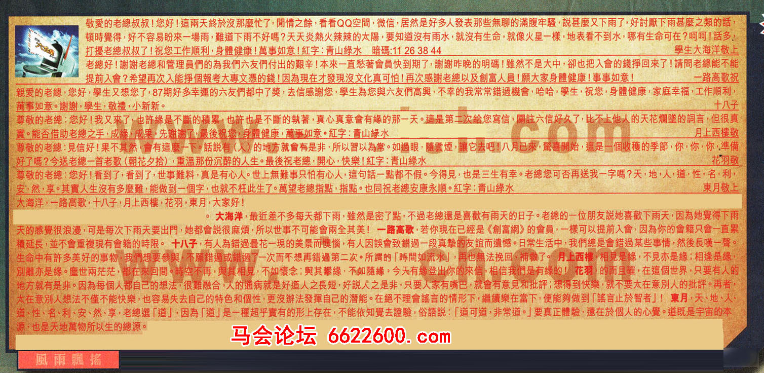 【1】敬愛的老總叔叔!您好!這兩天終於沒那麼忙了,聞情之餘,看看QQ空間,微信,居然是好多人發表那些無聊的滿腹牢騷,說甚麼又下雨了,好討厭下雨甚麼之類的話,頓時覺得,好不容易盼來一場雨,難道下雨不好嗎?天天炎熱火辣辣的太陽,要知道沒有雨水,就沒有生命,就像火星一樣,地表看不到水,哪有生命可在?呵呵!話多:打擾老總叔叔了!祝您工作顺利,身體健康!萬事如意!紅字:青山綠水 暗碼:11 26 38 44 ---學生大海洋敬上