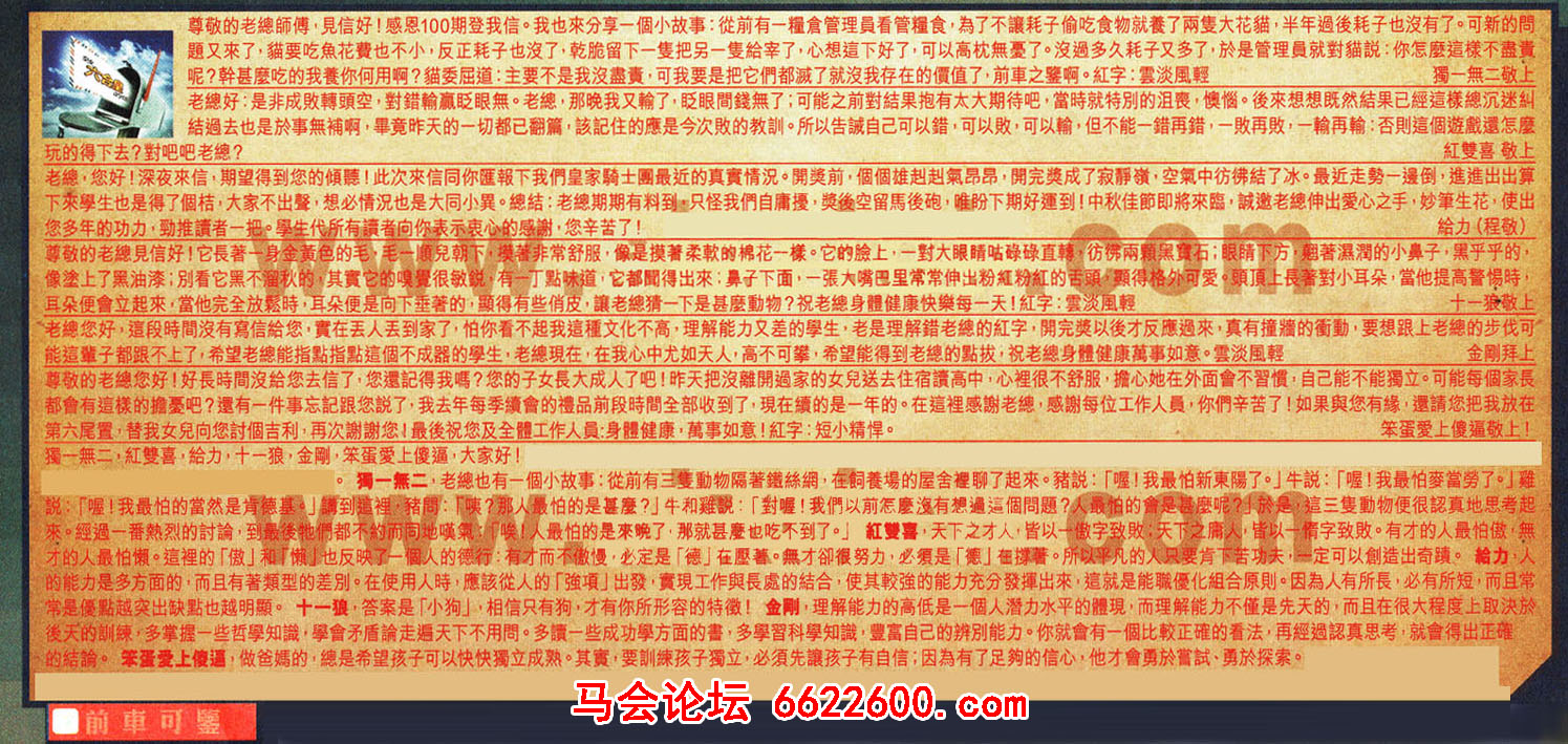 【6】尊敬的老總您好!好長時間沒給您去信了,您還記得我嗎?您的子女長大成人了吧!昨天把沒離開過家的女兒送去住宿讀高中,心裡很不舒服,擔心她在外面會不習慣,自己能不能獨立。可能每個家長都會有這樣的擔憂吧?還有一件事忘記跟您說了,我去年每季續會的禮品前段時間全部收到了,現在續的是一年的。在這裡感謝老總,感謝每位工作人员,你們辛苦了!如果與您有緣,還請您把我放在第六尾置,替我女兒向您討個吉利,再次謝謝您!最後祝您及全體工作人员:身體健康,萬事如意!紅字短小精悍。--- 笨蛋爱上傻逼敬上!