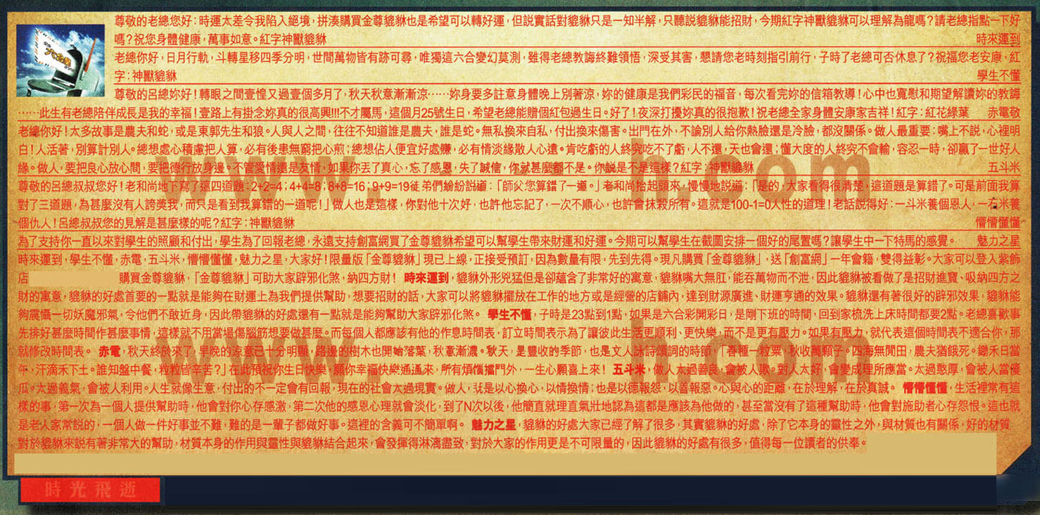 【2】.老總你好,日月行軌,斗轉星移四季分明,世間萬物皆有跡可尋,唯獨這六合變幻莫測,雖得老總教誨終難領悟,深受其害,懇請您老時刻指引前行,子時了老總可否休息了?祝福您老安康,紅字:神獸貔貅    學生不懂