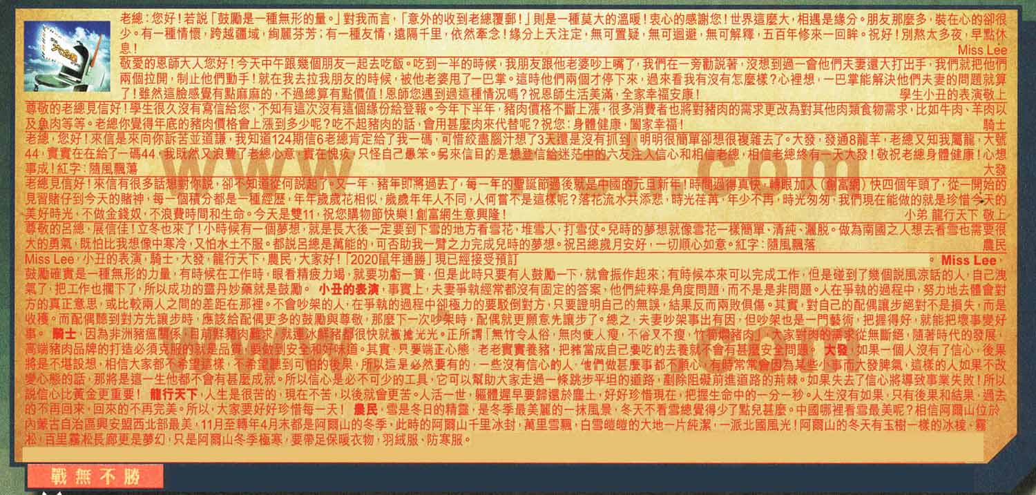 【5】.老總見信好!來信有很多話想對你說,卻不知道從何說起了。又一年,豬年即將過去了,每一年的聖誕節過後就是中國的元旦新年!時間過得真快,轉眼加入(創富網)快四個年頭了,從一開始的見習賭仔到今天的賭神,每一個積分都是一種經歷,年年歲歲花相似,歲歲年年人不同,人何嘗不是這樣呢?落花流水共添悲,時光荏苒,年少不再,時光匆匆,我們現在能做的就是珍惜今天的美好時光,不做金錢奴,不浪費時間和生命。今天是雙11,祝您購物節快樂!創富網生意興隆!    小弟 龍行天下 敬上