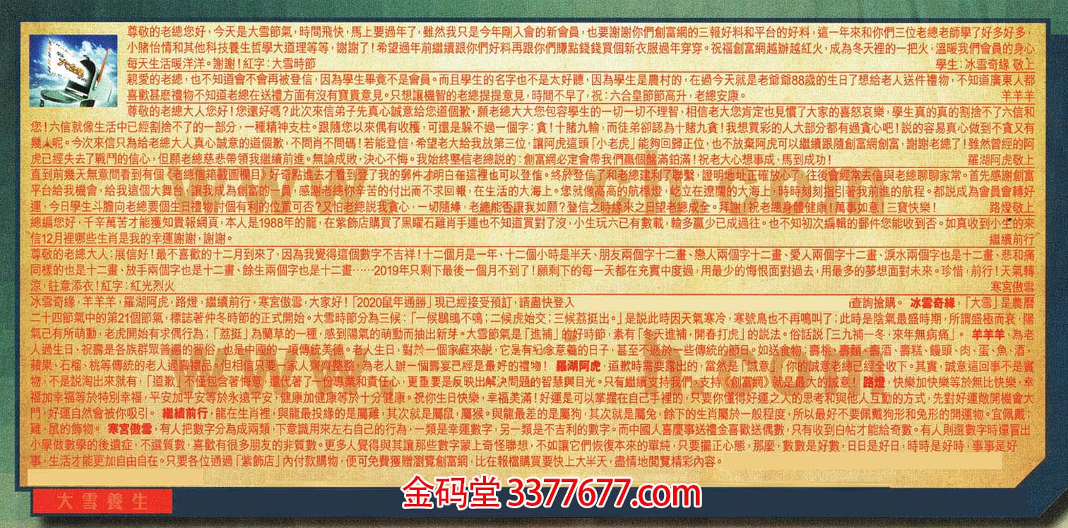 【1】尊敬的老總您好,今天是大雪節氣,時間飛快馬上要過年了,雖然我只是今年剛入會的新會員,也要謝謝你們創富網的三報好料和平台的好料,這年來和你們三位老總老師學了好多好多,小賭怡情和其他科技養生哲學大道理等等,謝謝了!希望過年前繼續跟你們好料再跟你們賺點錢錢買個新衣服過年穿穿。祝福創富網越辦越紅火,成為冬天裡的一把火溫暖我們會員的身心每天生活暖洋洋。謝謝!紅字:大雪時節------冰雪奇缘敬上