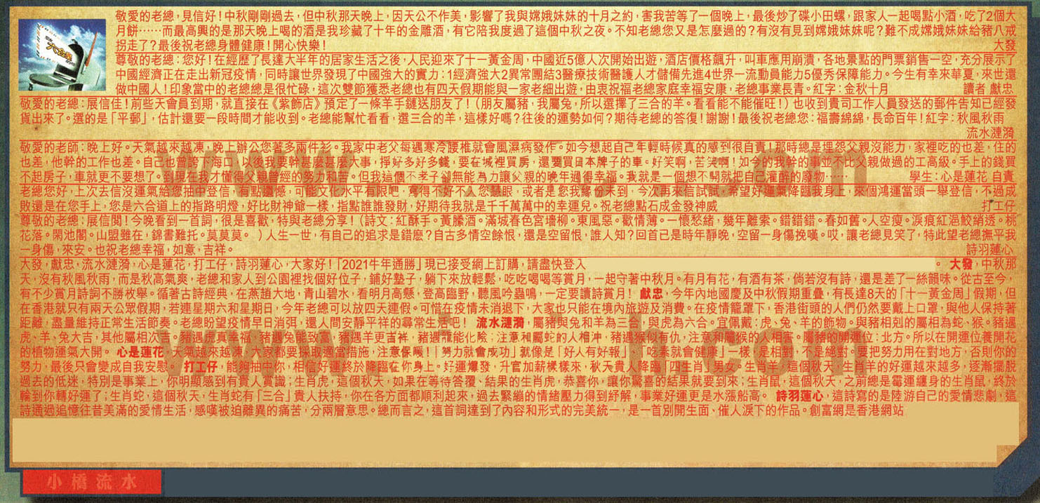 【5】老總您好,上次去信沒運氣給您抽中登信有點遺憾,可能文化水平有限吧,寫得不好不入您慧眼,或者是您我緣份未到今次再來信試試,希望好運氣降臨我身上,來個鴻運當頭一舉登信,不過成敗還是在您手上,您是六合道上的指路明燈好比財神爺一樣,指點誰誰發財,好期待我就是千千萬萬中的幸運兒。祝老總點石成金發神威 ---打工仔