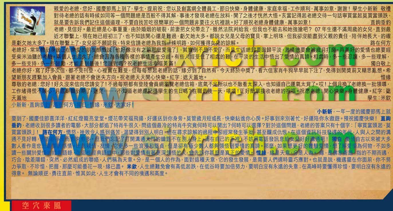 【5】.老總你好,寫了好多次信,都不見刊登,心理實在難受,但每每想起老縂的話,缘分到了自然有,今天終於中獎了,看六信家肖牛狗早早就下注了,免得到開獎前又糊思亂想。希望新朋友趕紧加人會員,跟著老總不會迷失方向。祝老總天天開心快樂·紅字:遮天蓋地。  惜緣