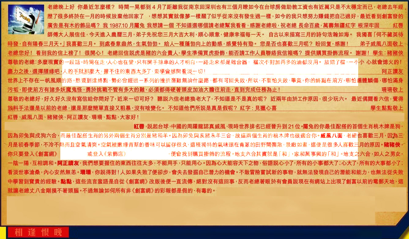 →〖點點〗:這些流言蜚語是自從《創富網》改版後便一直流傳 ,絕對沒有這回事 ,反而老總著眼於有會員說現在有網站上出現了創富以前的電郵天地,這就讓老總丈八金剛摸不著頭腦。不過無論如何所有非《創富網》的彩報都是假的、有毒的。
