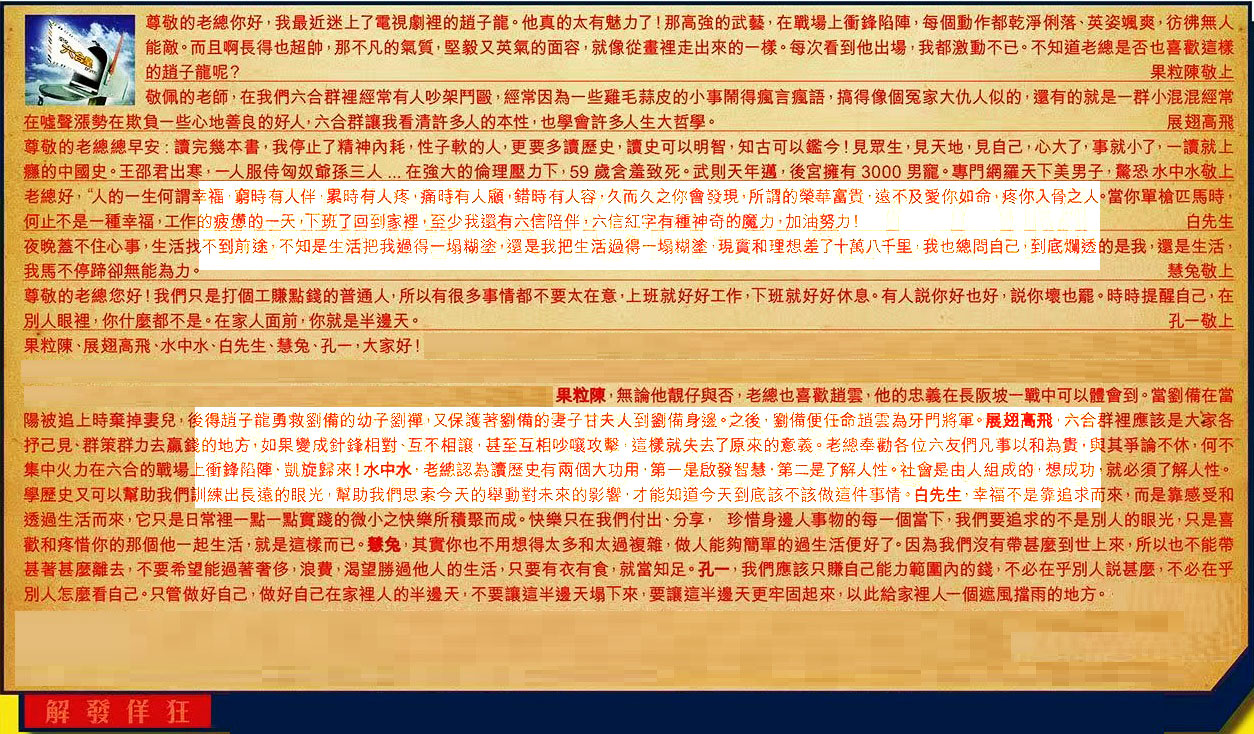→〖展翅高飛〗:六合群裡應該是大家各抒己見、群策群力去贏錢的地方,如果變成針鋒相對、互不相讓,甚至互相吵嚷攻擊,這樣就失去了原來的意義。老總奉勸各位六友們凡事以和為贵,與其爭論不休,何不集中火力在六合的戰場上街鋒陷陣、凱旋歸來!