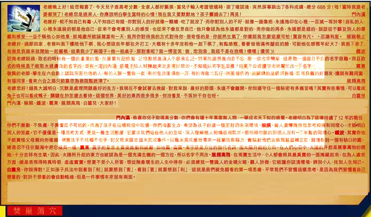 →〖門內漢〗:恭喜你兒子取得高分數,你們會有種十年寒窗無人問,一舉成名天下知的感覺。老總明白為了這場持續了12年的戰役,你們不激動、不焦慮、不興奮是不可能的。而為了孩子在這場戰役中取勝,你們竭盡全力,希望為孩子創造一個更好的未來環境。