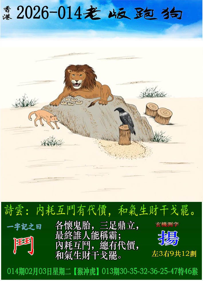 014期老版跑狗一字記之曰:【鬥】 玄機測字:《揚》