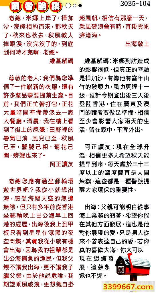 104期:彩民推荐〖貼信讀者論壇〗