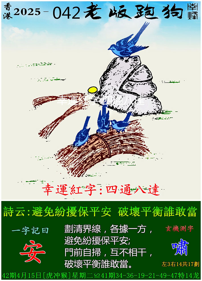 主题 : 042期老版跑狗一字記之曰:【嘯】 玄機測字:《安》