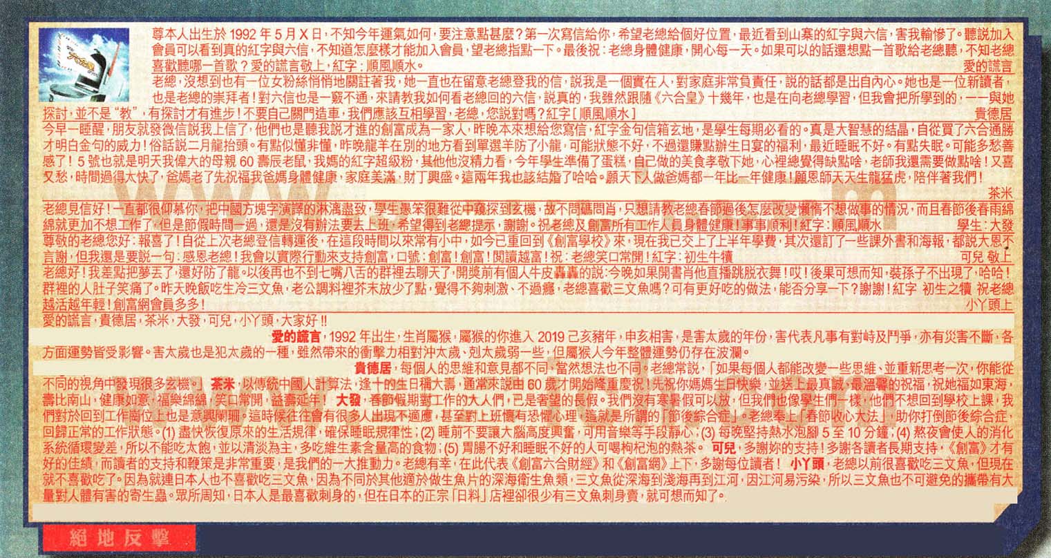 【1】尊本人出生於1992年5月X日,不知今年運氣如何,要注意點甚麼?第一次寫信給你,希望老總給個好位置.最近看到山寨的紅字與六信,害我輸慘了。聽說加入會員可以看到真的紅字與六信,不知道怎麼樣才能加入會員,望老總指點一下。最後祝:老總身體健康,開心每一天。如果可以的話還想點一首歌給老總聽,不知老總喜歡聽哪一首歌?愛的謊言敬上,紅字:順風順水。 ---愛的謊言