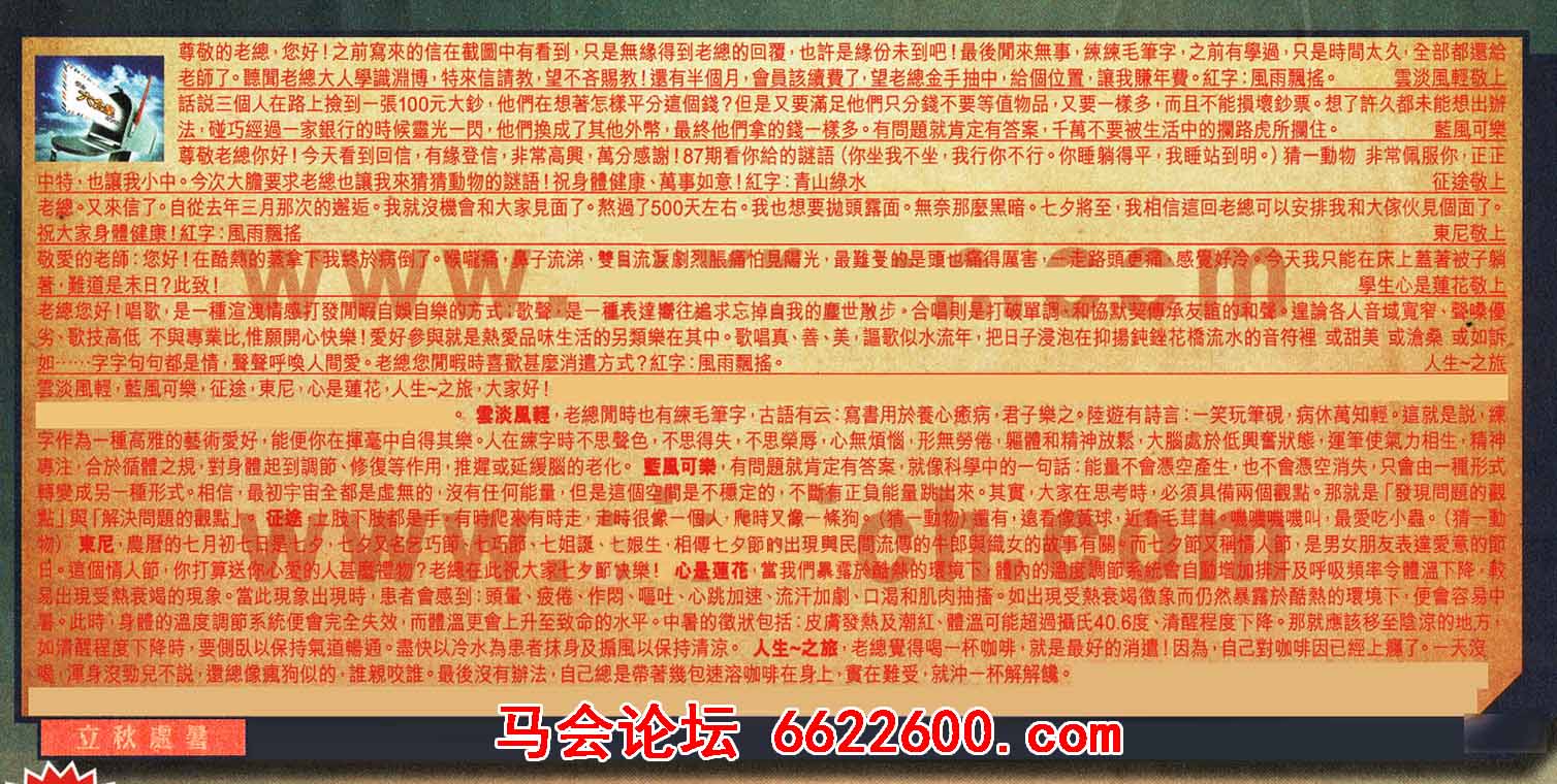 【4】.老總。又來信了。自從去年三月那次的邂逅。我就沒機會和大家見面了。熬過了500天左右。我也想要拋頭露面。無奈那麼黑暗。七夕將至,我相信這回老總可以安排我和大像伙見個面了。祝大家身體健康!紅字:風雨飘搖  東尼敬上