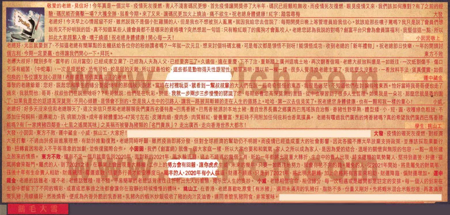 【5】.尊敬的老總爺爺:您好,說起您和學生的緣分要從18年的那個秋天說起。當時在村裡玩耍,就看到一幫叔叔輩的大人們在說一些奇奇怪怪的東西,我很是迷茫,不知道他們在討論些啥東西。恰好當時我哥哥便也走了過來,我就問他:哥哥,叔叔他們在說些啥呀??哥哥就說:他們是在玩彩。於是,我就一步兩步三步慢慢的認識了您,每期必看您高深莫测的言語,從中也學習到了很多人生哲理。如果我是一朵花,那麼您就是我的園丁,如果我是您的話語高深莫測,不用心傾聽,是領會不到的。您是我人生中的引路人,讓我一路披荊斬棘的走在人生的道路上。哈哈,第一次去信見笑了。祝老總您身體健康,也有一顆和我一樣的童心!  小威