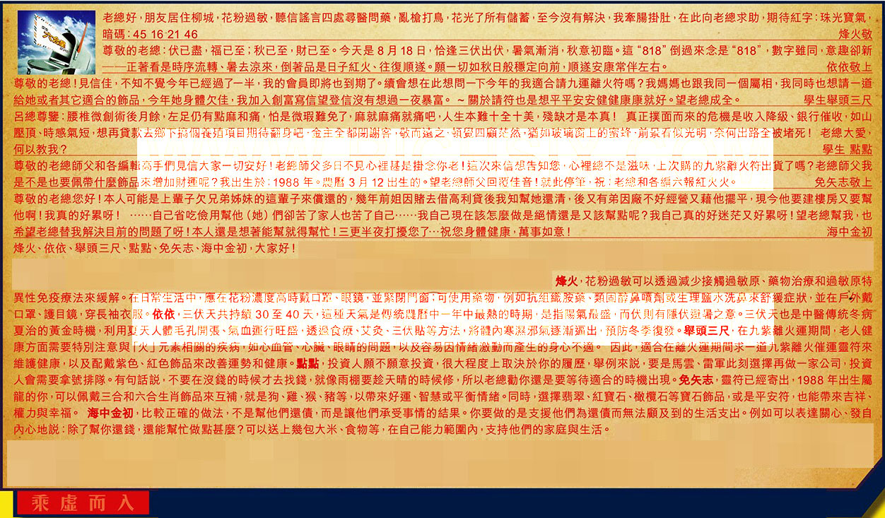 【3】.尊敬的老總!見信佳,不知不覺今年已經過了一半,我的會員即將也到期了。續會想在此想問一下今年的我適合請九運離火符嗎?我媽媽也跟我同一個屬相,我同時也想請一道給她或者其它適合的飾品,今年她身體欠佳,我加入創富寫信望登信沒有想過一夜暴富。~關於請符也是想平平安安健健康康就好。望老總成全。 學生舉頭三尺